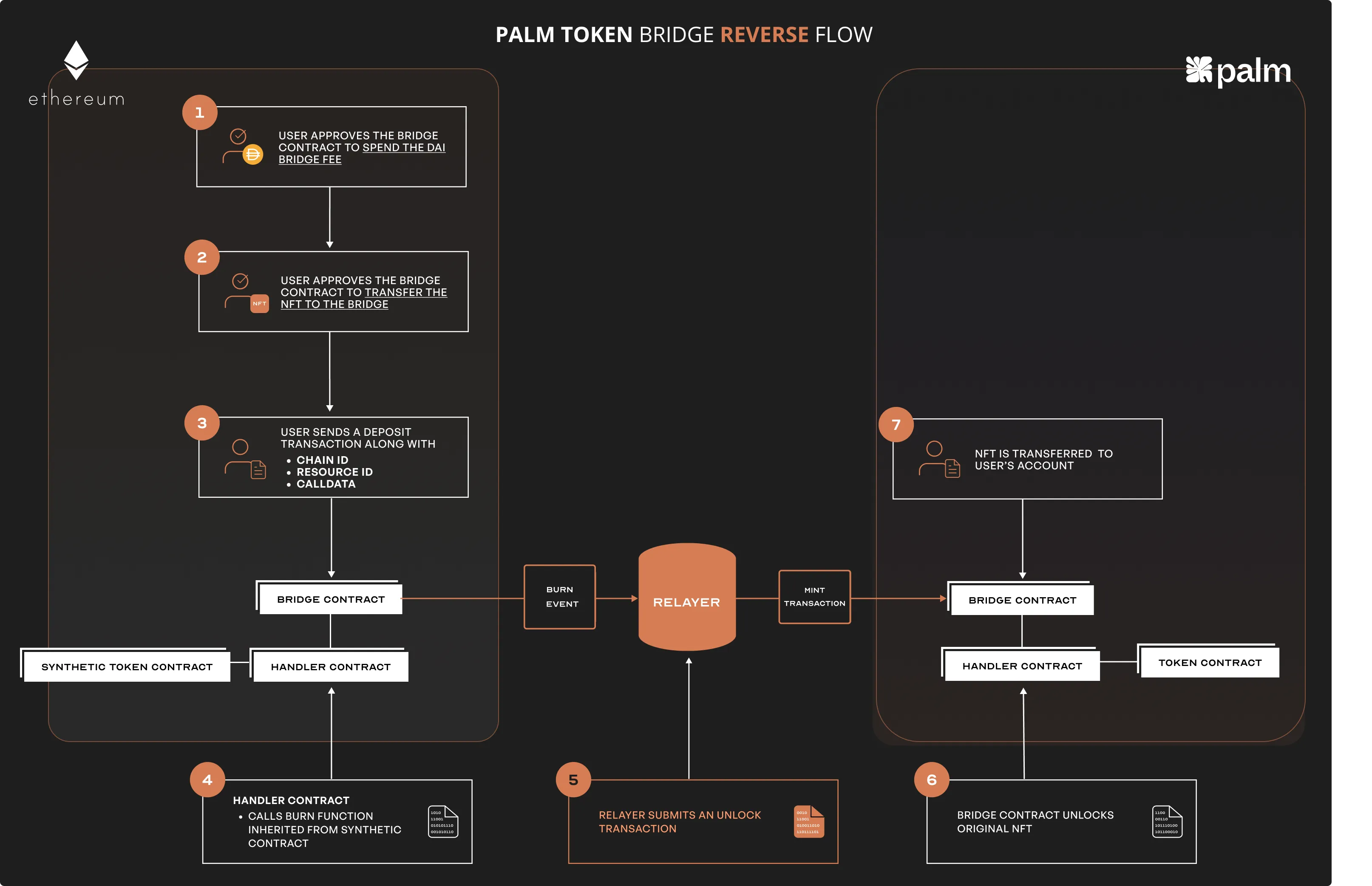 Below is the workflow occurring when a user transfers an ERC-721 token from the Palm network to Ethereum: